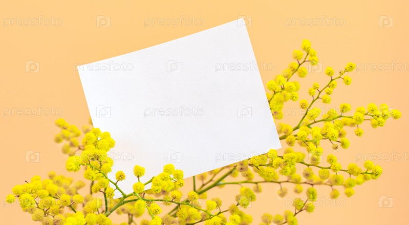 8 марта, день рождения, День матери, День святого Валентина, Пасхальная открытка с пустым белым листом на желтой ветке мимозы на модном коралловом фоне. Макет весеннего праздника. Скопируйте пространство