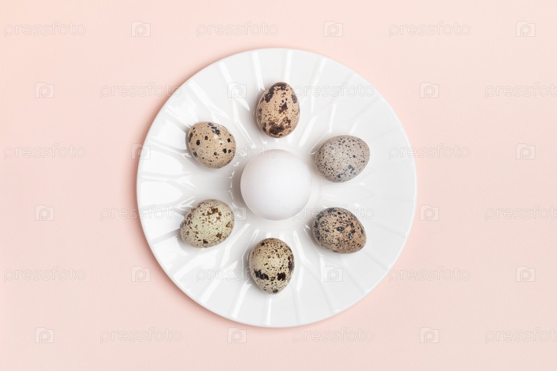 Пасхальный макет с одним белым куриным яйцом в кругу перепелиных яиц на белой тарелке на пастельно-розовом