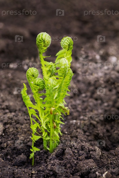 Молодые зеленые побеги папоротника Polypodiophyta на весеннем грунте. Растения в природе. Выборочный фокус