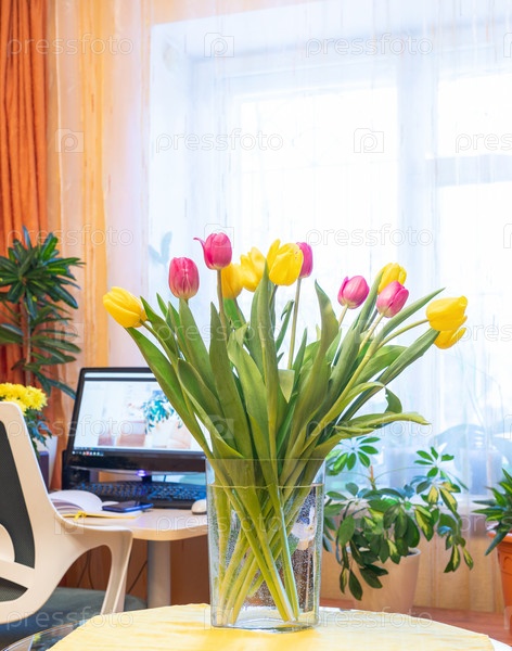 Свежий весенний букет тюльпанов в вазе в столе возле окон в гостиной с домашним рабочим местом с монитором компьютера. Уютный домашний праздник 8 марта, день рождения, концепция Дня святого Валентина. Вертикальная ориентация
