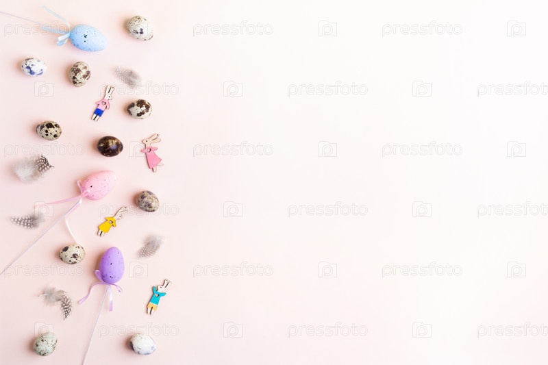Плоский фон пасхальных украшений. Красочные кролики, яйца, перья на розовом. Скопируйте пространство