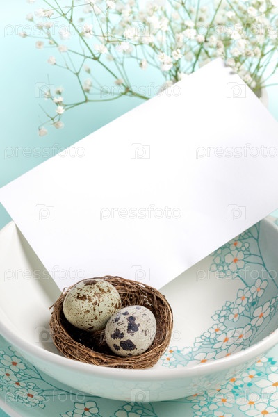 Белая пустая пустая записка на тарелках с цветочным узором с перепелиными яйцами в гнезде крупным планом на голубом. Романтическая праздничная пасхальная открытка с белыми цветами. Поздравление или приглашение макет. Скопируйте пространство
