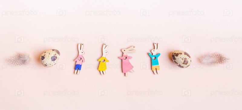 Забавные красочные деревянные кролики, перепелиные яйца, перья, выложенные в ряд на розовой бумаге. Пасхальное знамя