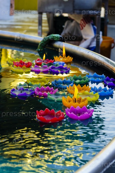 Жертвенные свечи в виде цветков лотоса плавают в сосуде с водой возле статуи Будды в праздник Будды Пурнимы