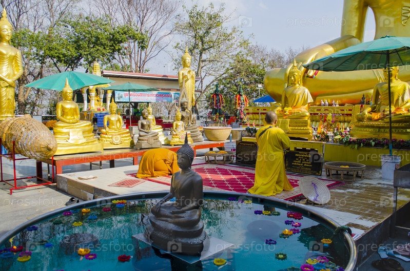 Буддийский монах в желтом платье молится перед статуей Будды в храме Большого Будды в Паттайе, Будда Пурнима - день рождения Будды