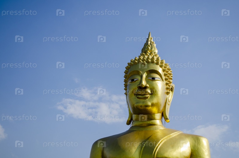 Голова статуи Большого Будды на фоне голубого ясного неба, место для копирования текста Будда Пурнима - день рождения Будды
