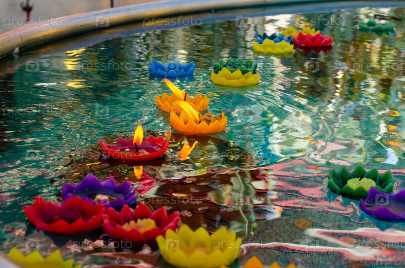 Разноцветные жертвенные свечи в виде цветков лотоса плавают в сосуде с водой возле статуи Будды в честь праздника Будды Пурнима - дня рождения Будды