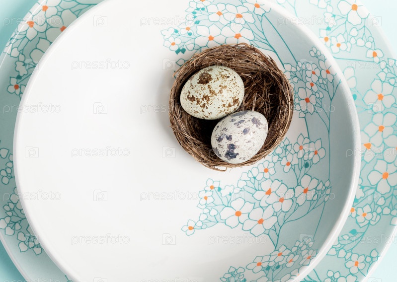 Два перепелиных яйца в гнезде на голубых тарелках с цветочным узором. Пасхальный макет на тарелке. Закрыть