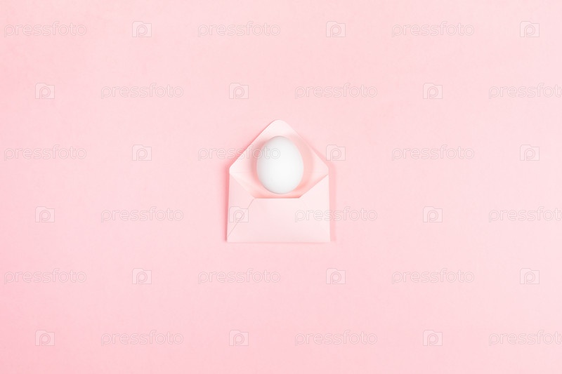 Пасхальная праздничная минимальная креативная модная монохромная концепция с одним белым яйцом на конверте на пастельно-розовом фоне с копией пространства