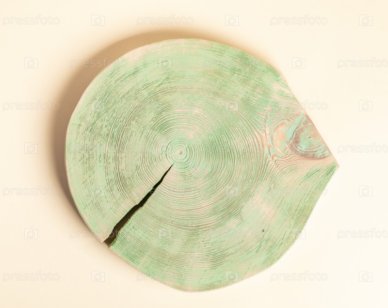 Брашированный, окрашенный в зеленый цвет деревянный срез сосны без коры с годовыми кольцами на пастельно-желтом фоне