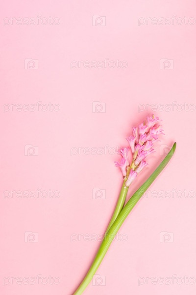 Весенний праздничный минимальный вертикальный фон с одним розовым цветком гиацинта на пастельно-розовом с копировальным пространством