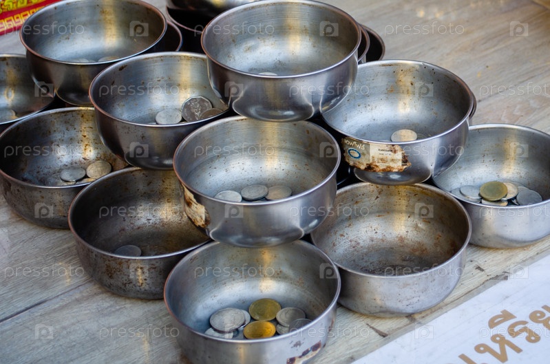 Металлические чаши с тайскими монетами для пожертвований в буддийском храме крупным планом