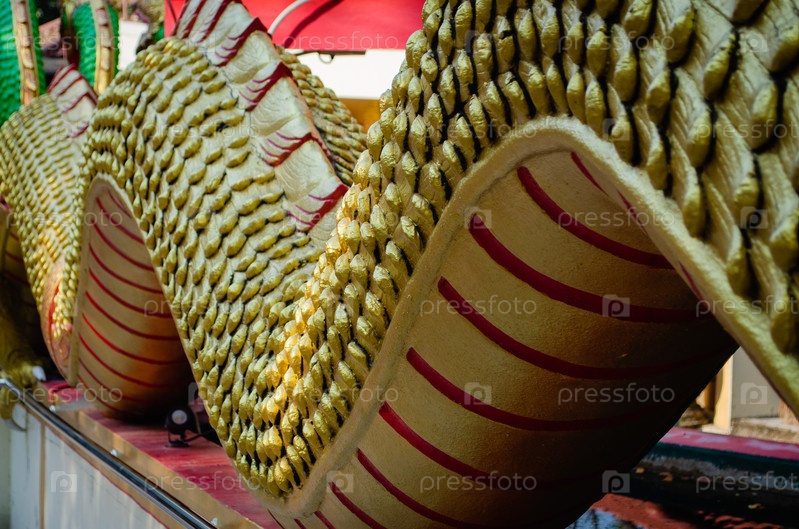 Чешуя тела скульптуры змеи в тайском буддийском храме крупным планом, изображение золотой статуи змеи Таиланда в текстуре храма, азиатский фон