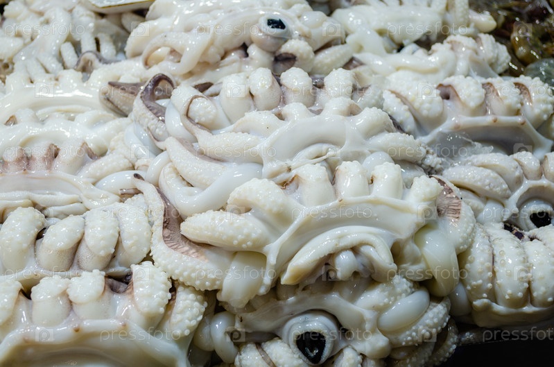 Много свежего белого чистого рынка морепродуктов осьминога, фон осьминога