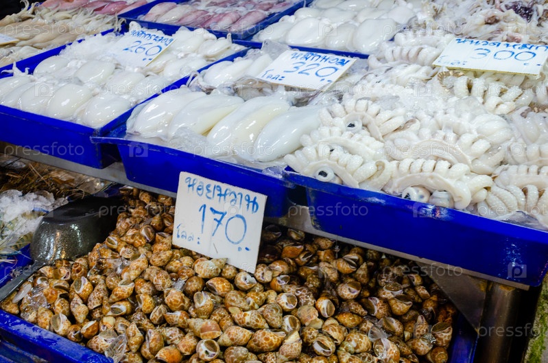 Свежие кальмары из морепродуктов, осьминоги, моллюски. Стойло на рынке морепродуктов в Таиланде. На ценниках по-тайски написано: кальмары, моллюски, осьминоги