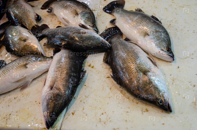 Свежая свежевыловленная рыба на белом прилавке на рынке морепродуктов в Таиланде