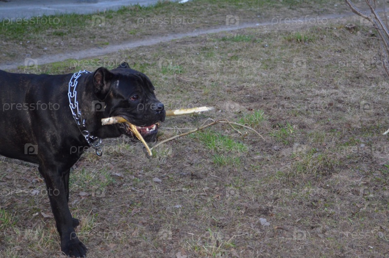 Портрет черной собаки породы Кане Корсо на прогулке
