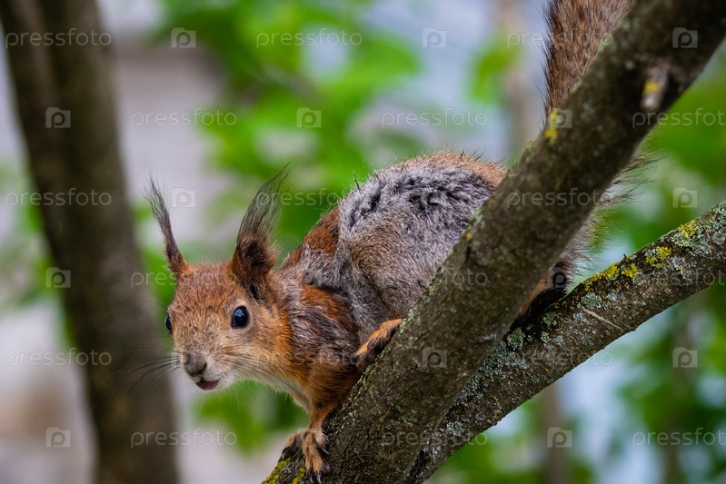 Белка весной в городском парке. Белка линяет. Белка в процессе линьки меняет зимний серый мех на рыжий летний