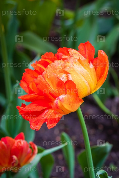 Один красивый огненно-красный махровый пионовидный тюльпан