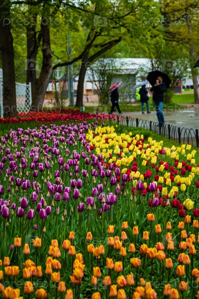 Весеннее поле красивых разноцветных тюльпанов. Фестиваль тюльпанов на Елагином острове в Центральном парке культуры и отдыха имени С.М.Кирова