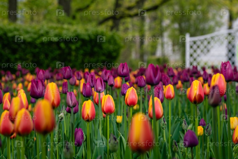 Весеннее поле красивых разноцветных тюльпанов. Фестиваль тюльпанов на Елагином острове в Центральном парке культуры и отдыха имени С.М.Кирова