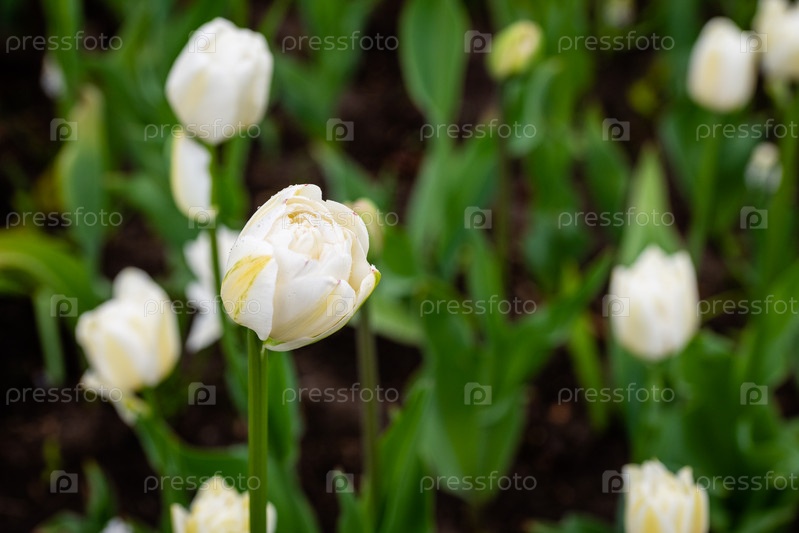 Белые тюльпаны в селективном фокусе крупным планом с размытым фоном. Фестиваль тюльпанов на Елагином острове в Центральном парке культуры и отдыха имени С.М.Кирова