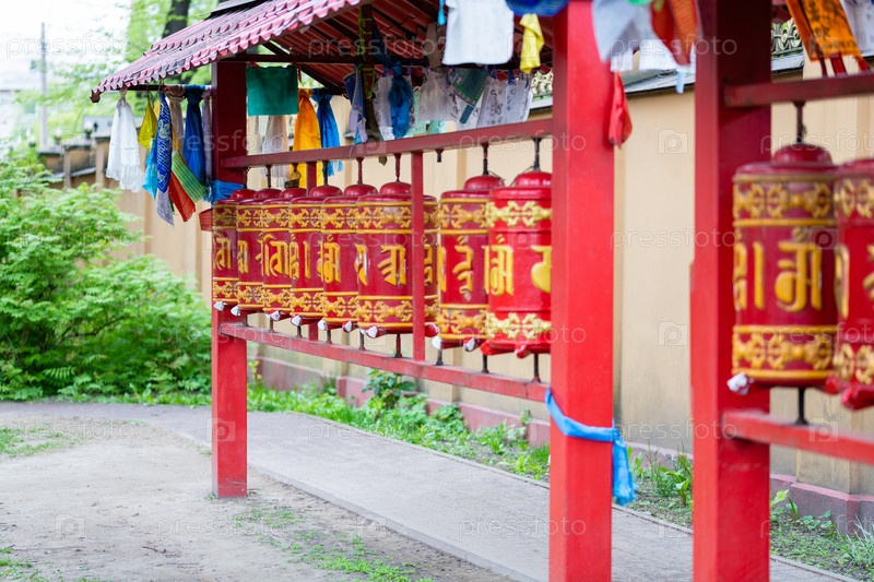 Красные молитвенные барабаны хурде с мантрами на улице возле буддийского храма бурятского дацана