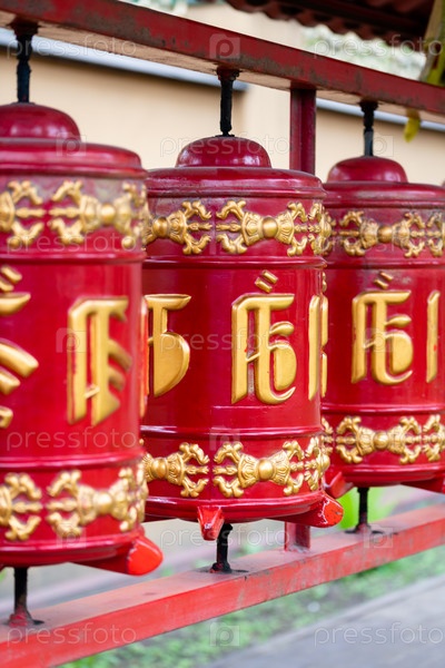 Красные молитвенные барабаны хурде с мантрами на улице возле буддийского храма бурятского дацана