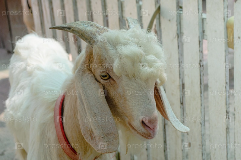 Крупным планом портрет белой козы. Молодой козел смотрит в камеру