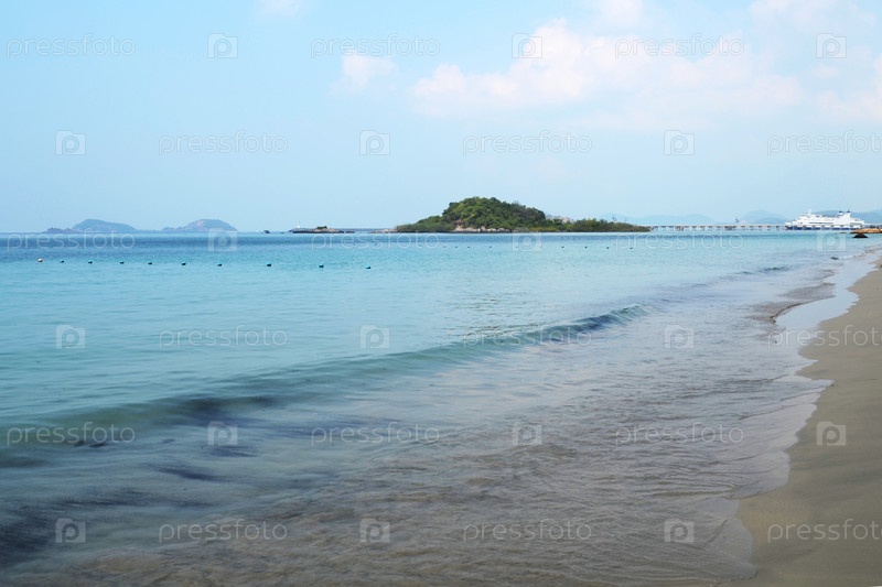 Концепция летнего отдыха на море. Линия песчаного морского берега. Желтый песок, бирюзово-синее море