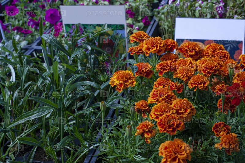 Саженцы садовых цветов, gazania rigens, вельветы, петунии в коробках с белыми ярлыками для надписей