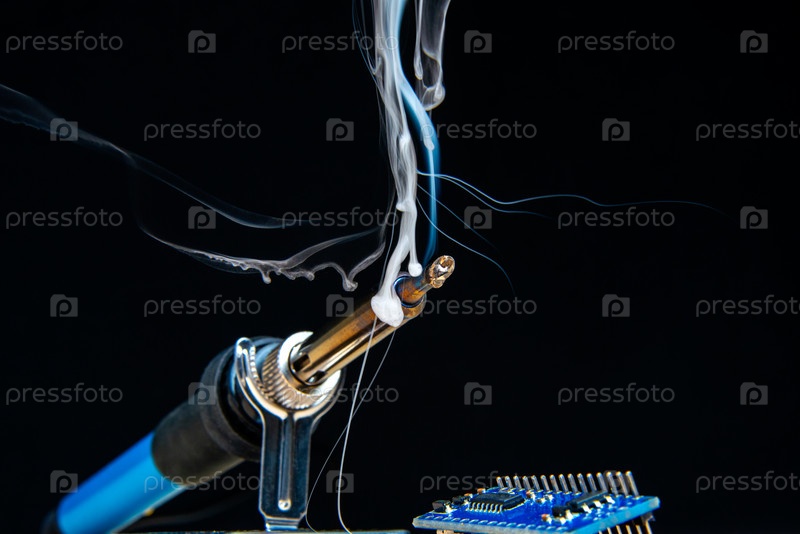 Разогретый дымящийся паяльник стоит на рабочем столе