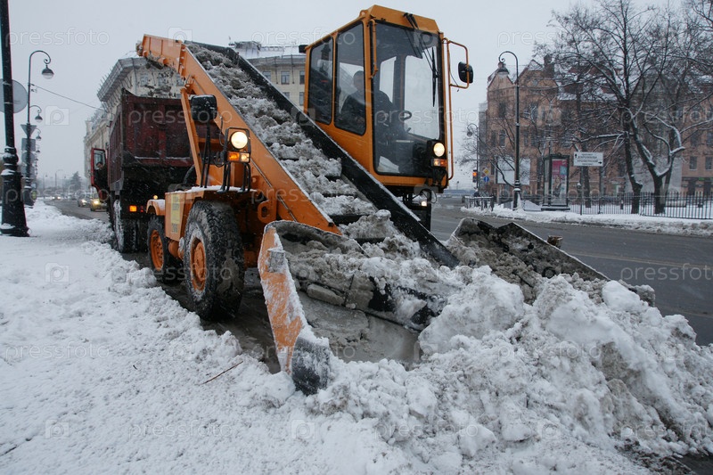 Россия. Санкт-Петербург. Снегоуборочная техника собирает снег на улице города. Россия. Санкт-Петербург. Оборудование для снятия снега собирает снег на улице города