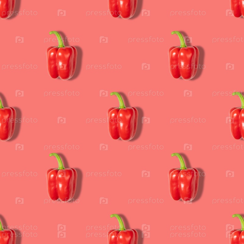 Бесшовный узор из красного перца на красном фоне. Овощной узор для печати. Абстрактный пищевой фон
