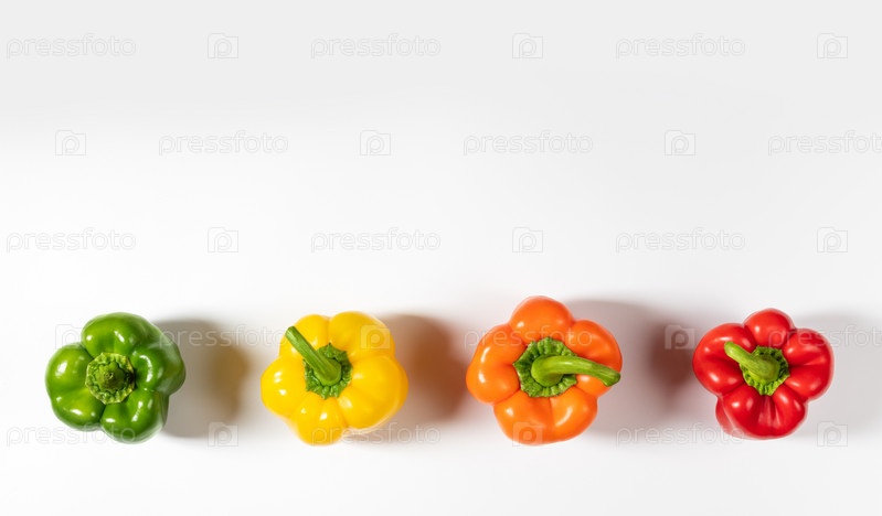 Цветные болгарские перцы на белом фоне. Зеленый, желтый, оранжевый и красный перец. Концепция еды