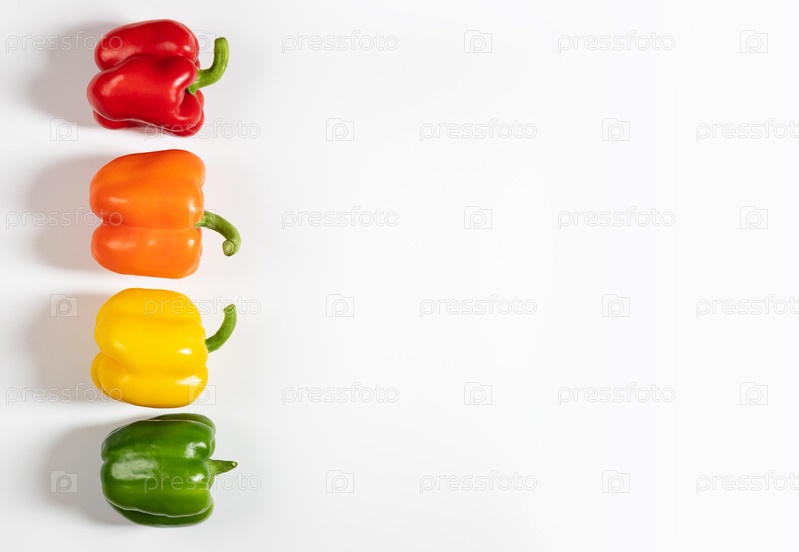 Цветные болгарские перцы на белом фоне. Зеленый, желтый, оранжевый и красный перец. Концепция еды