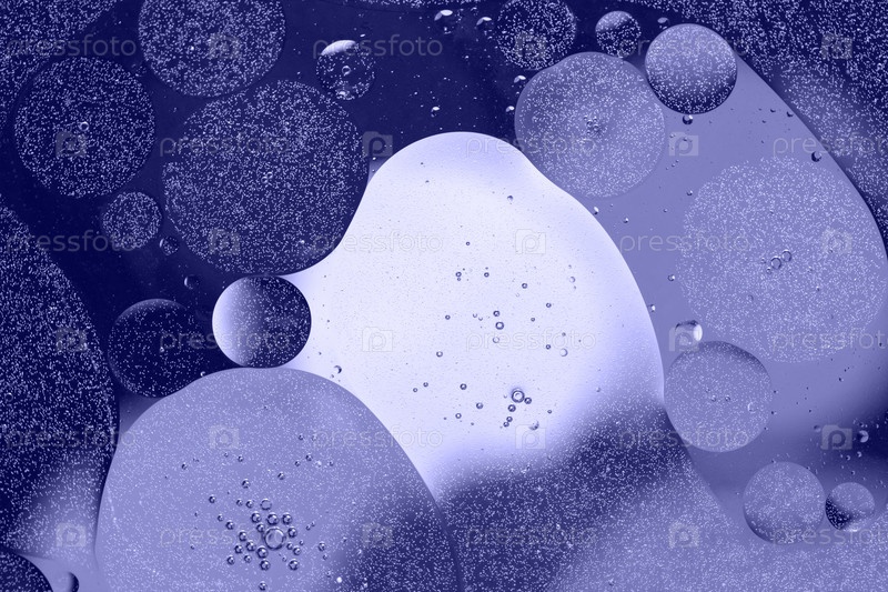 Абстрактный фон. Фиолетовые круги и масляные пузыри в воде крупным планом. Абстракция макроса. Модный цвет очень пери в 2022 году