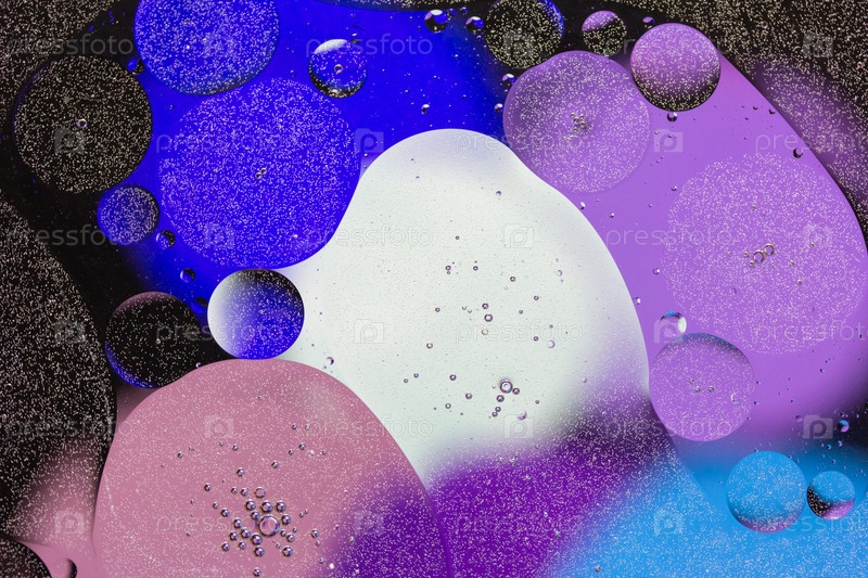Красочный абстрактный фон. Фиолетовые, синие круги и масляные пузыри в воде крупным планом. Абстракция макроса
