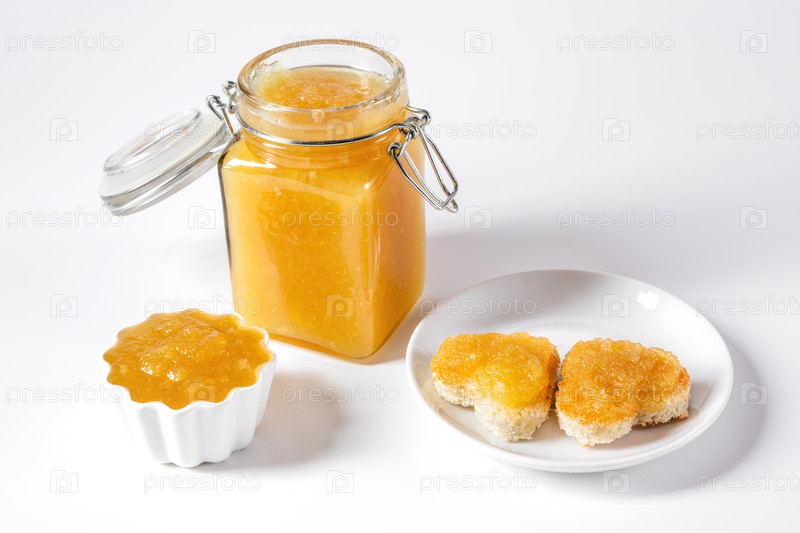 Домашнее вкусное фруктовое варенье в стеклянной банке и миске на белом фоне. Скопируйте пространство