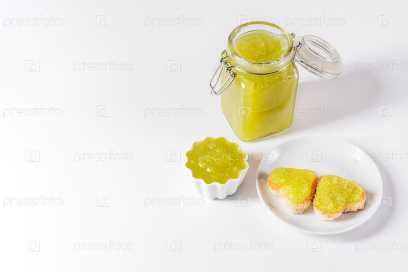 Домашний вкусный зеленый джем в стеклянной банке и тост в форме сердца на белом фоне