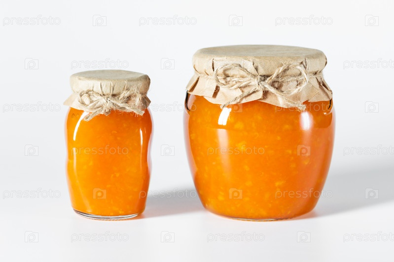 Вкусный домашний джем в стеклянных банках на белом фоне