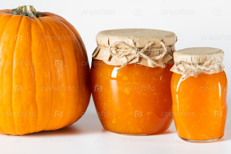 Вкусное домашнее тыквенное варенье в стеклянных банках на белом фоне
