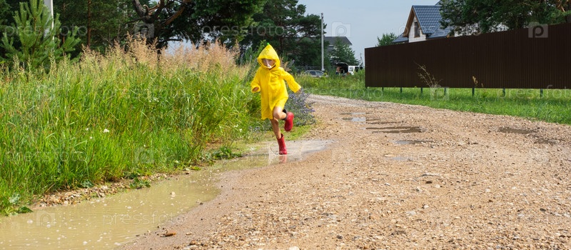 Девушка в красных резиновых сапогах и желтом плаще бежит по лужам после дождя в деревне. Лето, свобода, детство