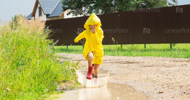 Девушка в красных резиновых сапогах и желтом плаще бежит по лужам после дождя в деревне. Лето, свобода, детство