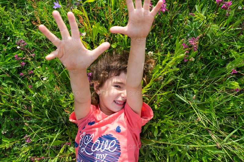 Портрет девочки летом, лежащей в траве и полевых цветах с пятками и ладонями. летнее время, свобода
