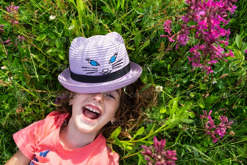 Портрет ребенка в шляпе с закрытым летом лицом, лежащего в траве и полевых цветах. Шляпа с глазами и ушами как у кошки, лето, свобода