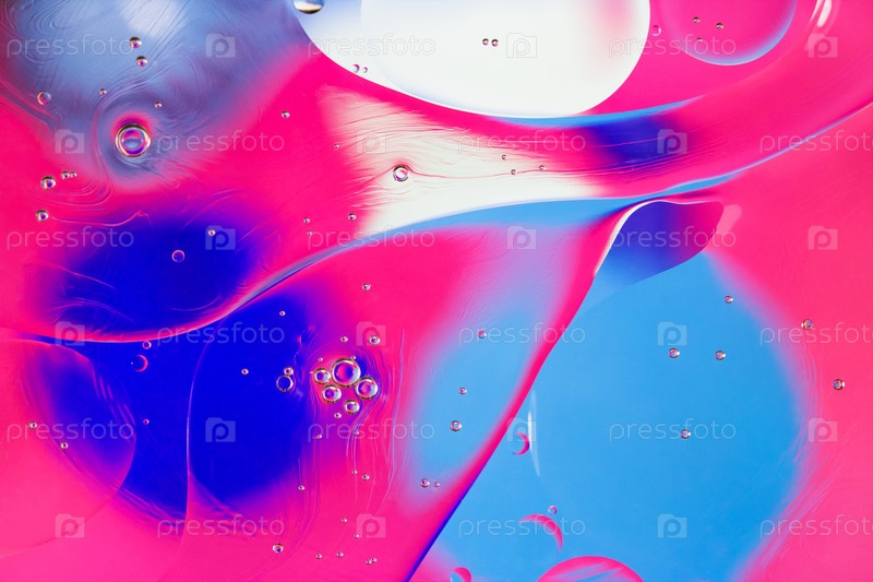 Красочный абстрактный фон. Розовые голубые белые круги и масляные пузыри в воде крупным планом. Абстракция макроса. Текстура и узор радужного масла
