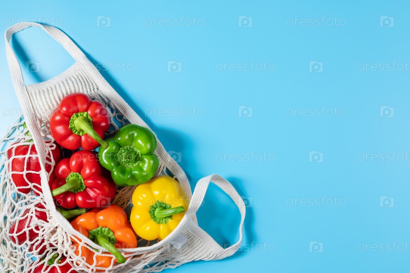 Концепция нулевых отходов. Овощи в экологически чистой многоразовой авоське на синем фоне. Без пластика. Здоровая свежая вегетарианская еда