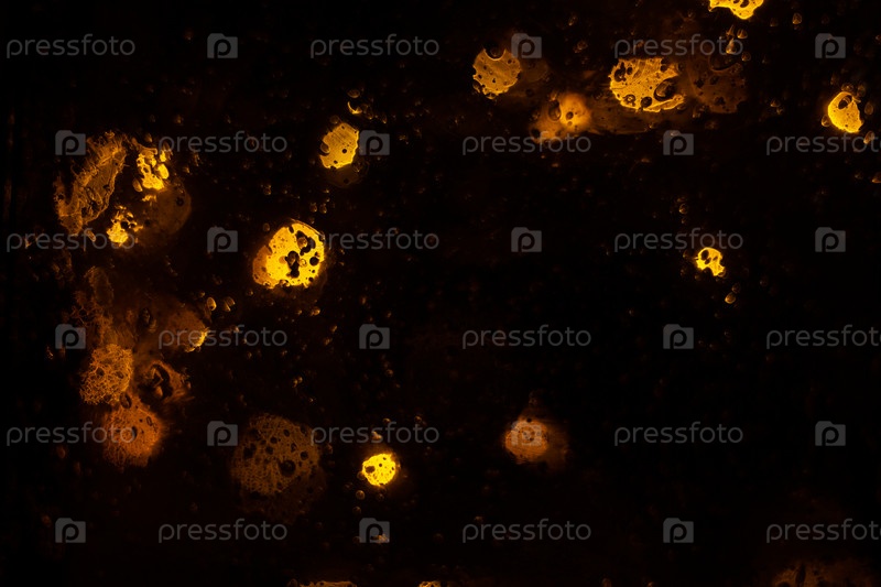 Золотые блестящие огни боке на темном фоне. Желтая блестящая размытая текстура. Огни и пузыри абстрактный расфокусированный фон