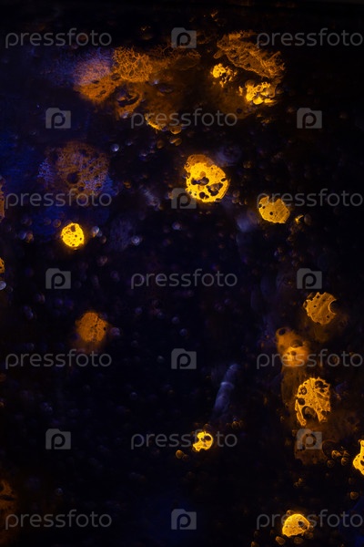 Золотые и синие сияющие огни боке на темном фоне. Желтая блестящая размытая текстура. Огни и пузыри абстрактный расфокусированный фон